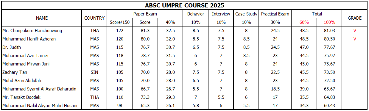 Congratulations to the new ABSC umpires awarded from 2025; Mr. Chonpakorn Hanchoowong from Thailand and Muhammad Haniff Azheran from Malaysia. Detailed scores of all deligates can be downloaded here.
